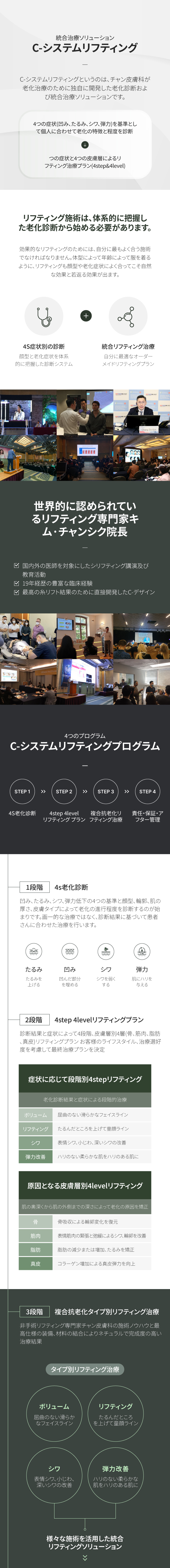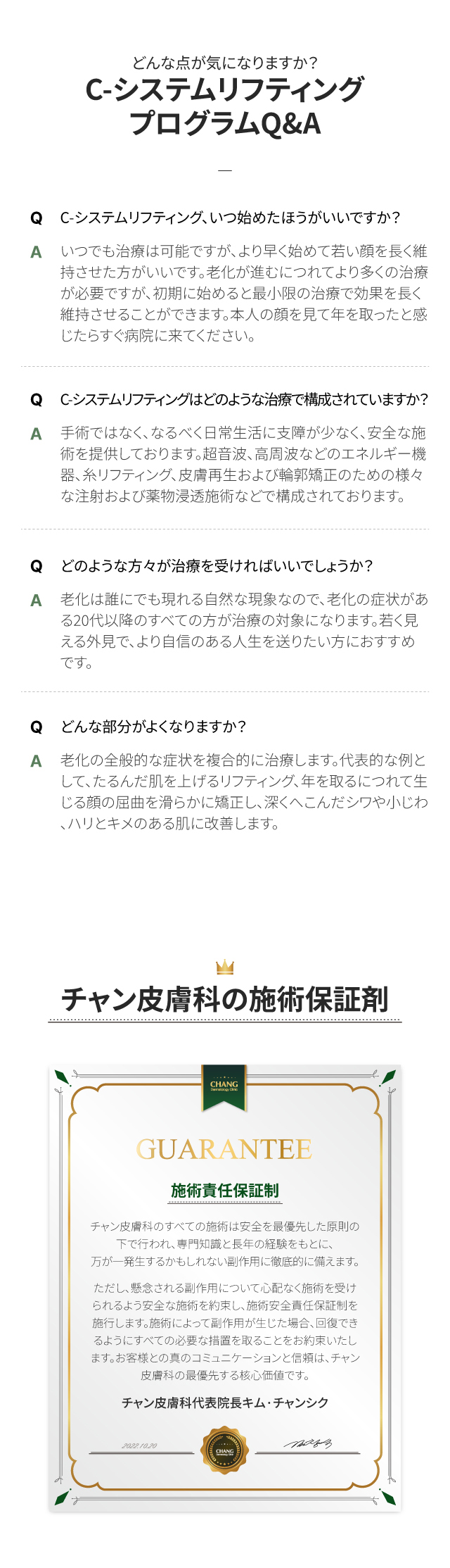 - C-システムリフティングというのは、チャン皮膚科が老化治療のために独自に開発した老化診断および統合治療ソリューションです。